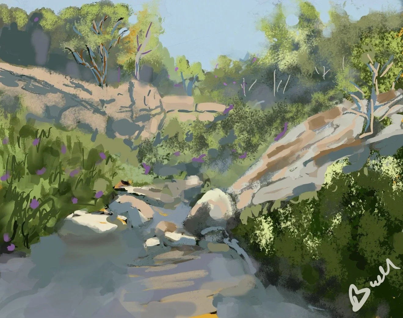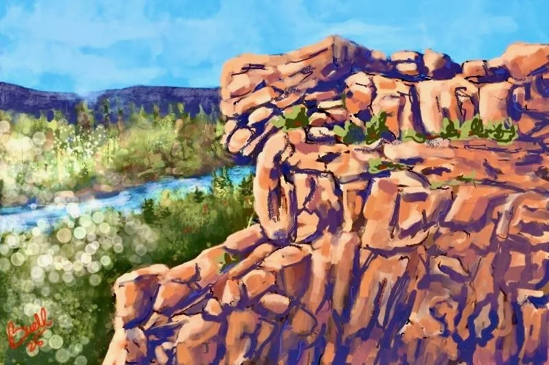 This park has become the muse for my current digital painting series, a tribute born partly out of convenience — it’s so close I can wander it on a whim — and partly out of longing. There’s something magnetic about the landscape east of my home: the vast sky, the fractured cliffs, the mountains rising faintly in the west.